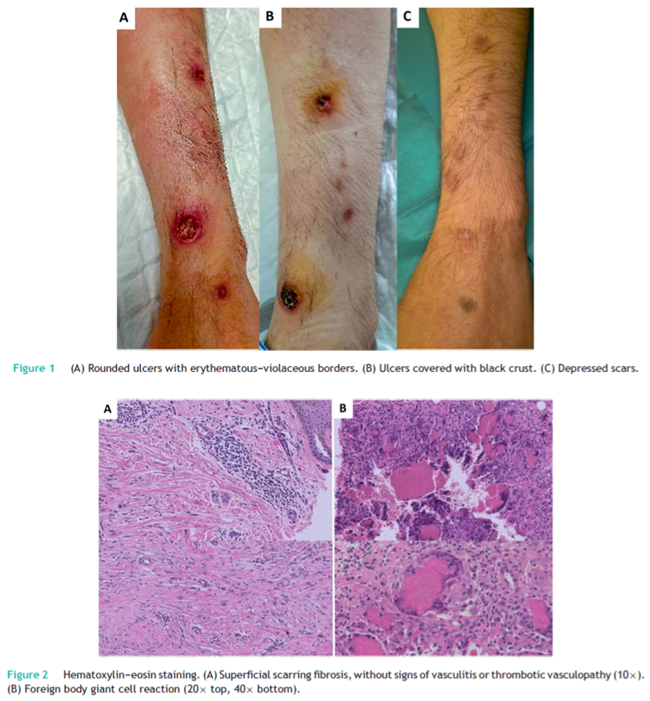 Так же наркотические препараты могут приводить к появлению токсикодермических реакций, например в виде стойких синюшно-красных зудящих пятен в любой локализации, в моей практике неоднократно встречались высыпания на коже аногенитальной области. Это может быть ошибочно принято за аллергию на мефедрон. Подобные высыпания могут возникать и при применении обычных лекарственных препаратов, например НПВС. Зуд может иметь нейрогенную природу и вызываться поражением нервных окончаний. Пример высыпаний из медицинского журнала, аналогичных тем, что я видел на своем приеме.